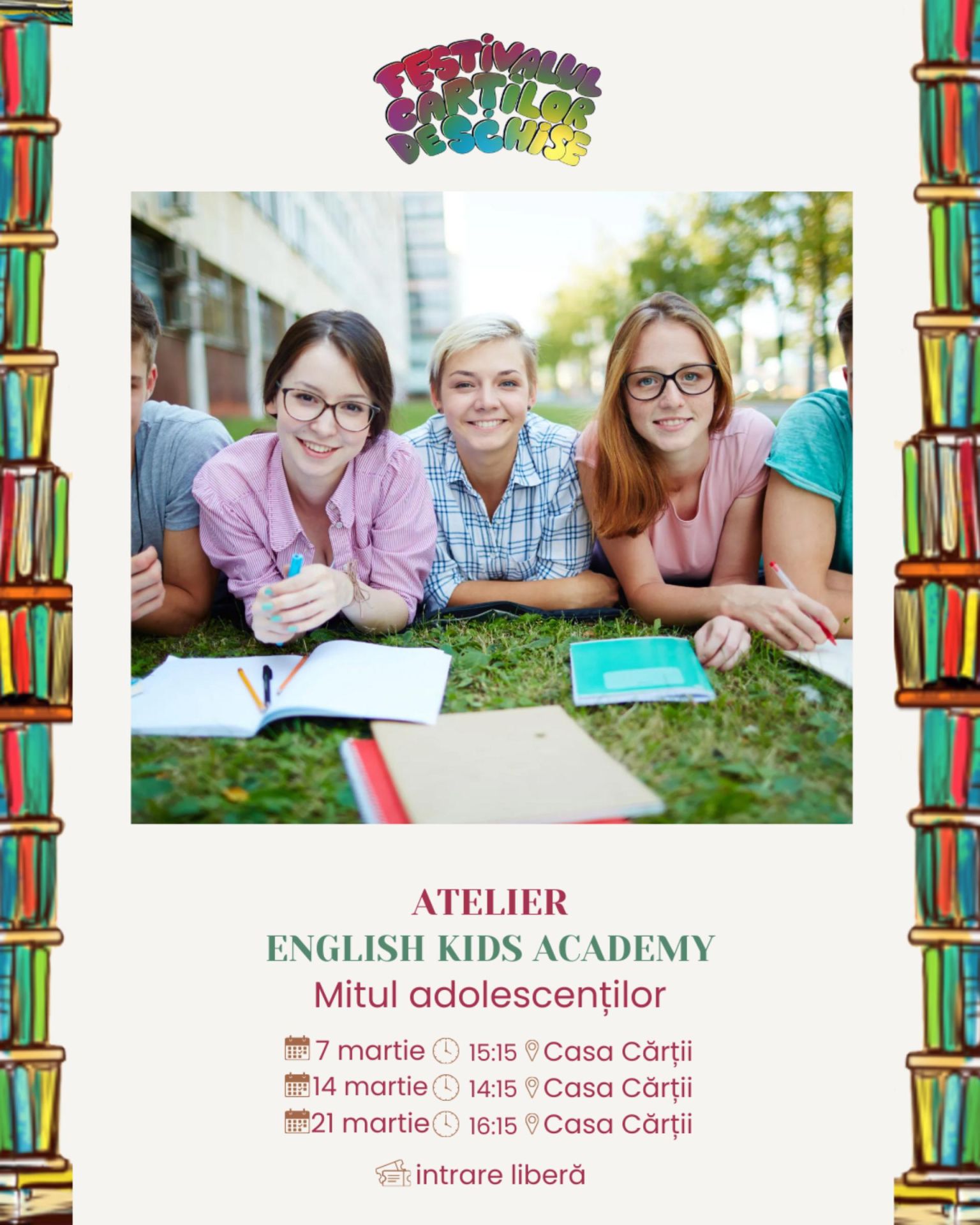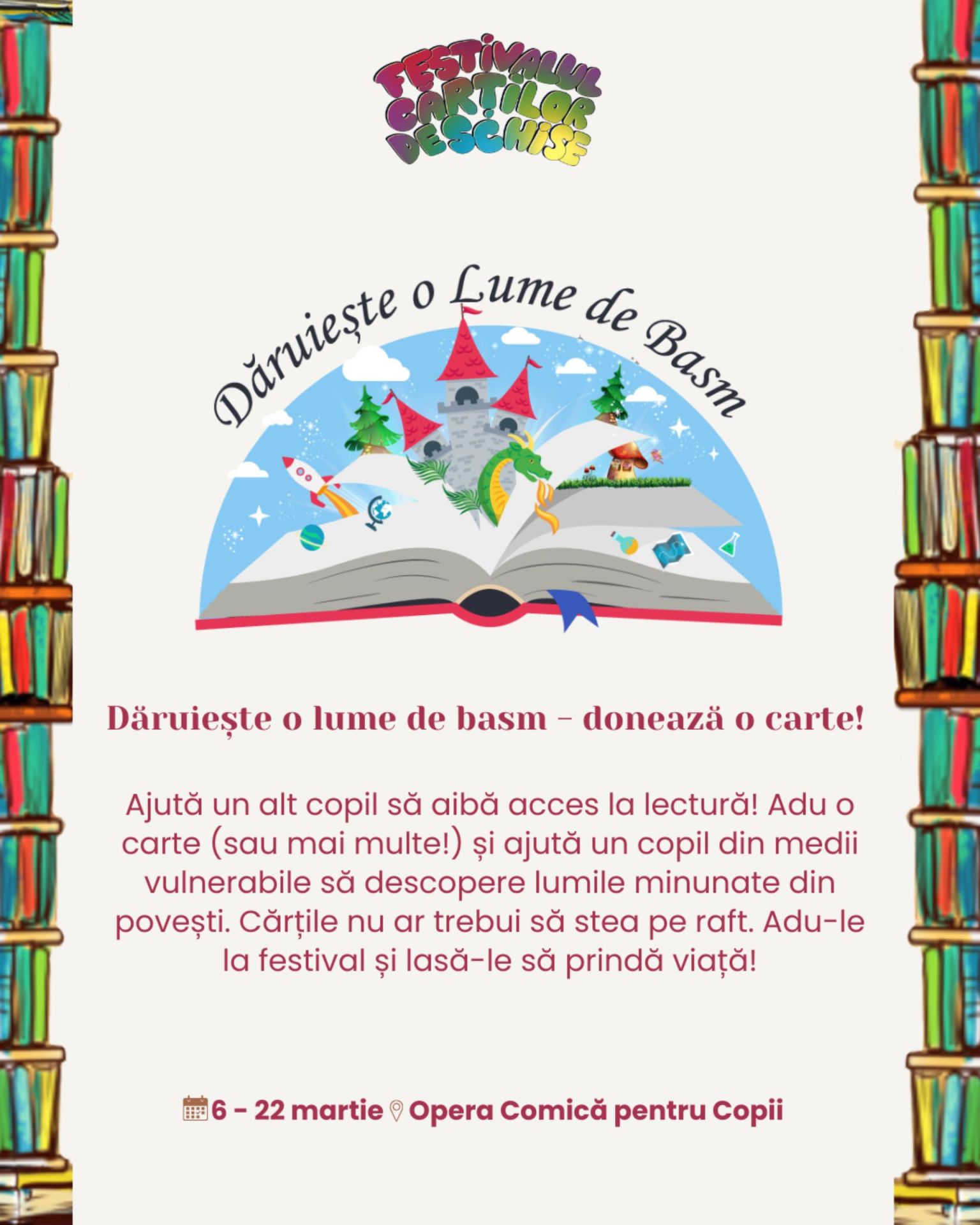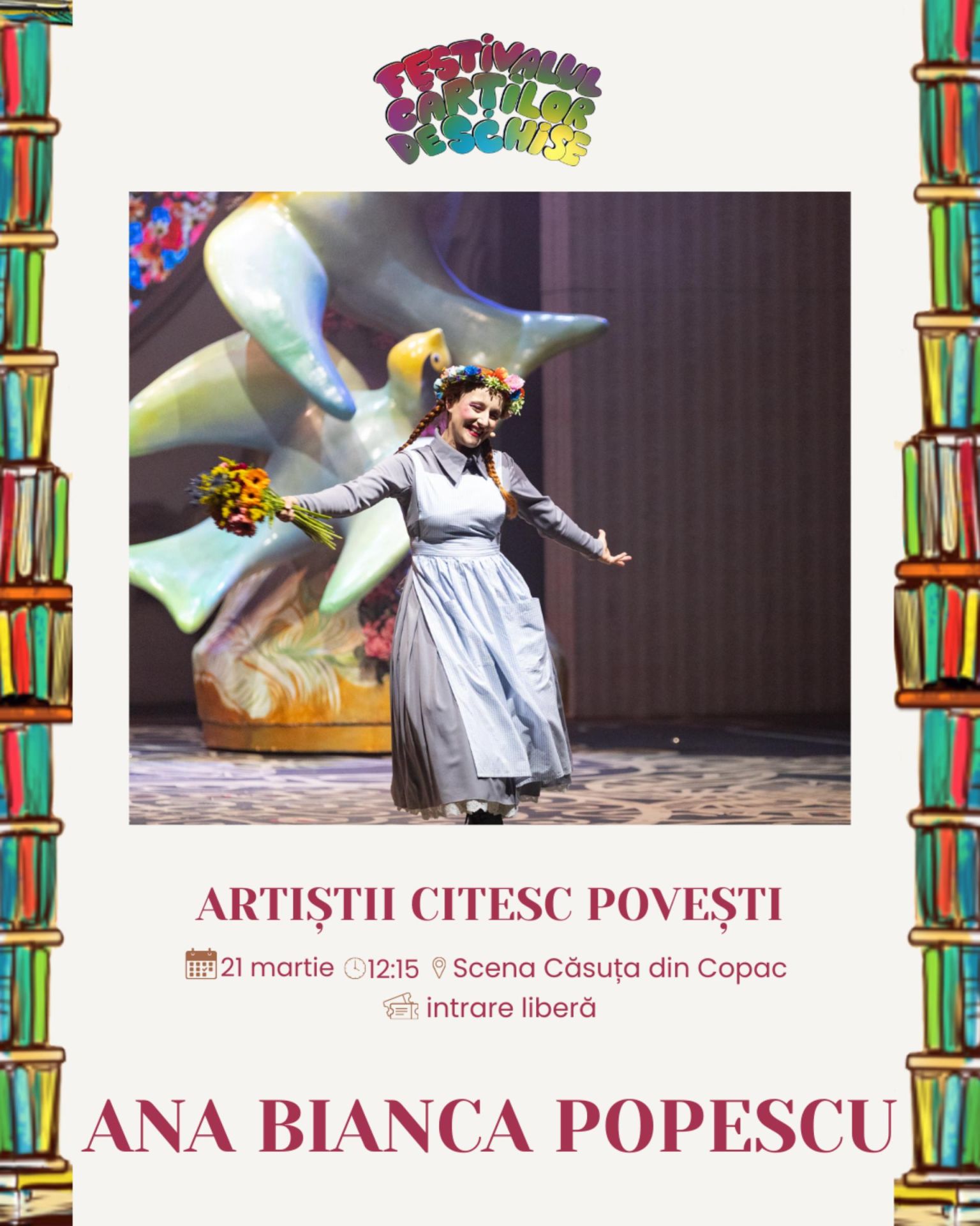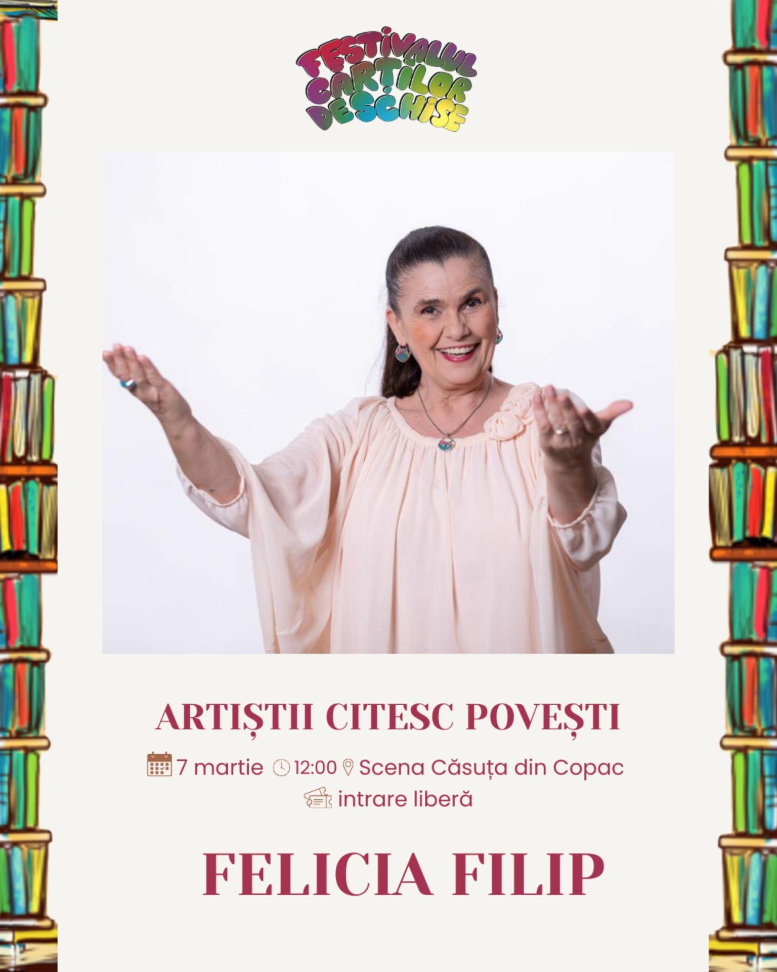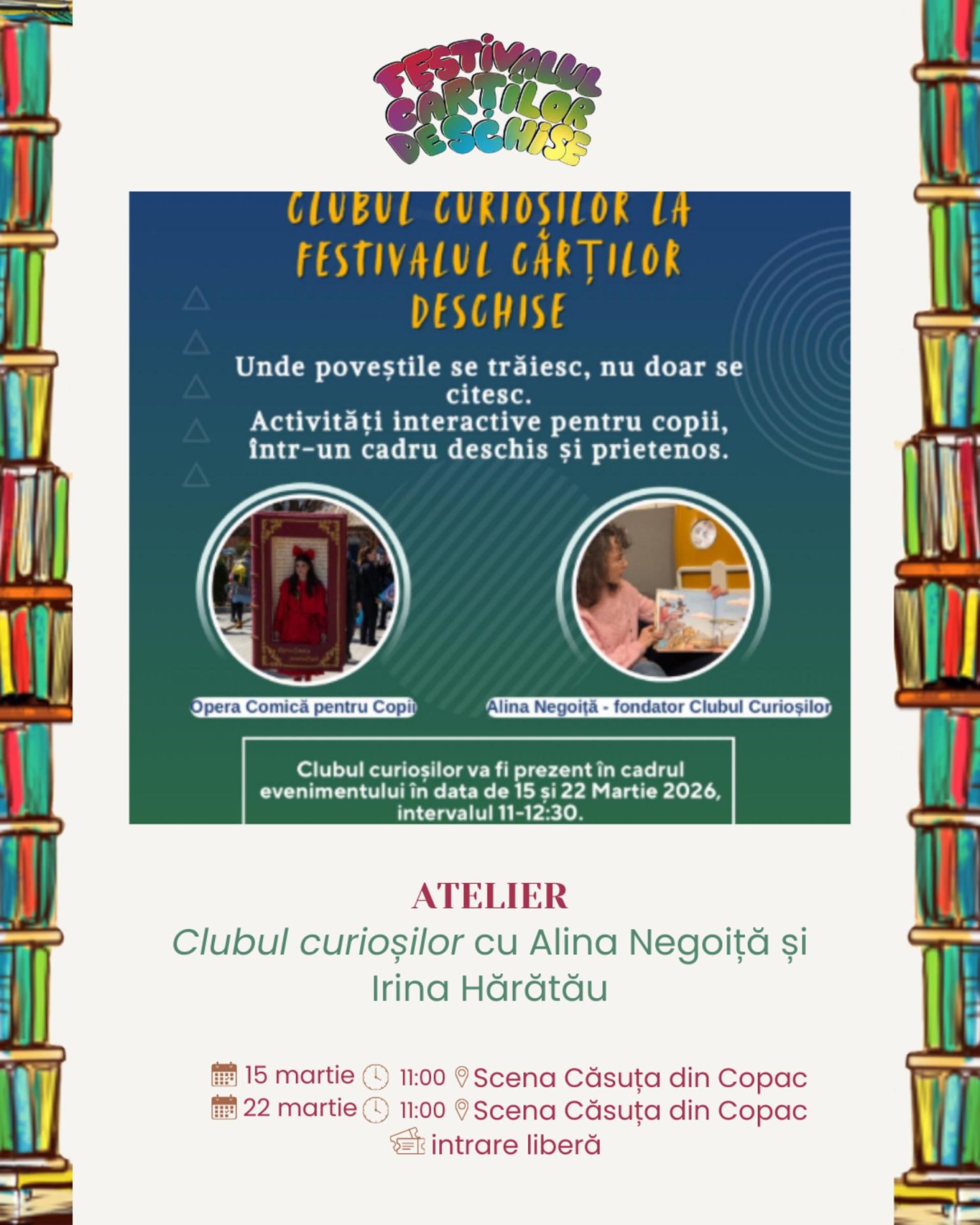 Primăvara dă semnalul trezirii frunzelor și florilor, dar și cărților, care ies din raft, capătă personalitate şi încep să-şi spună poveştile printre oameni. Copiii le iau în mâini, le răsfoiesc în lumina soarelui, le citesc la microfon, le transformă în desene, poezii, în conversații purtate chiar cu cei care le-au scris. Festivalul Cărților Deschise propune o relaţie directă cu literatura: o lasă să fie rostită cu voce tare, o mută din pagină în spații neașteptate, în dialoguri spontane, în ateliere în care hârtia reciclată devine felicitare, iar florile uscate se transformă în cadouri creative.