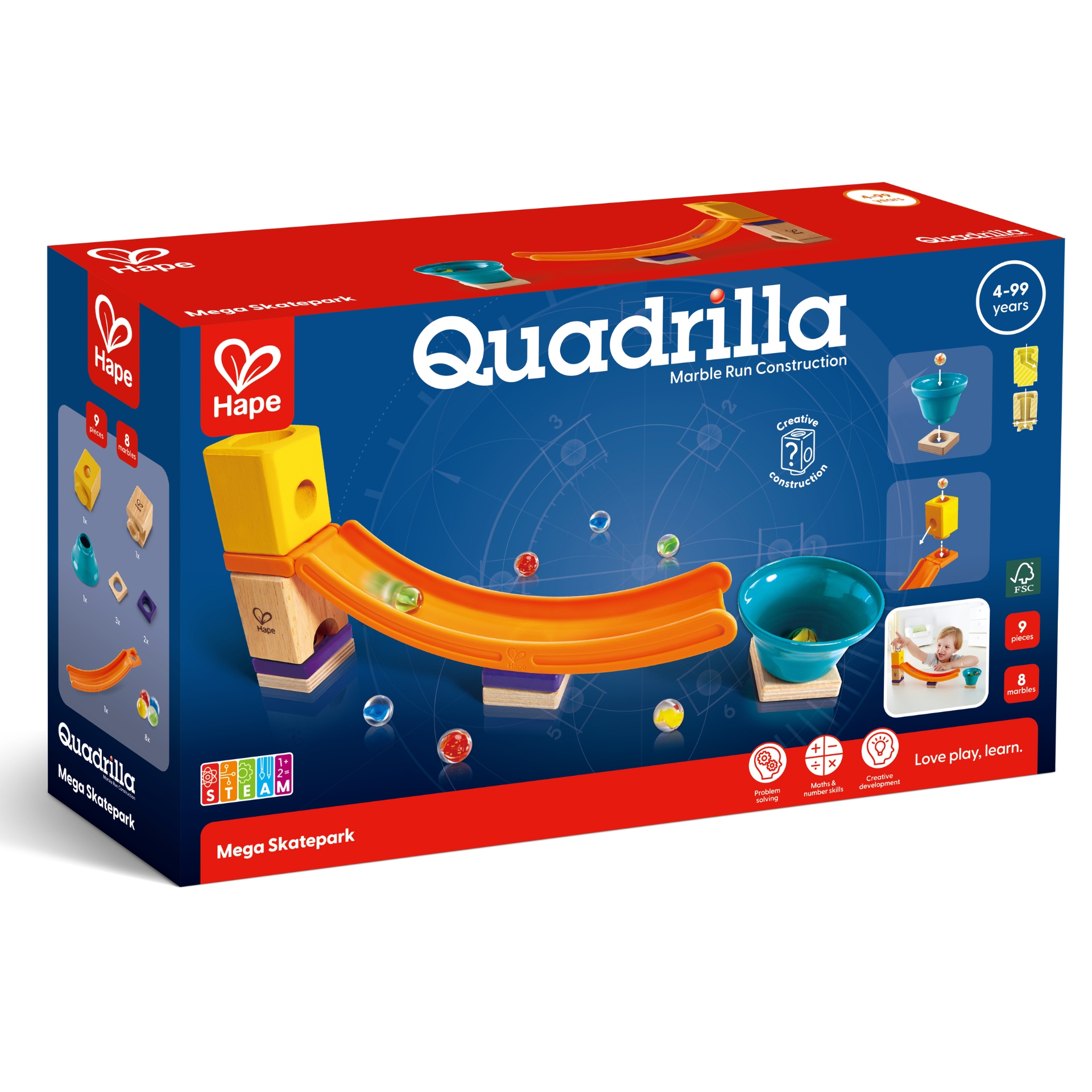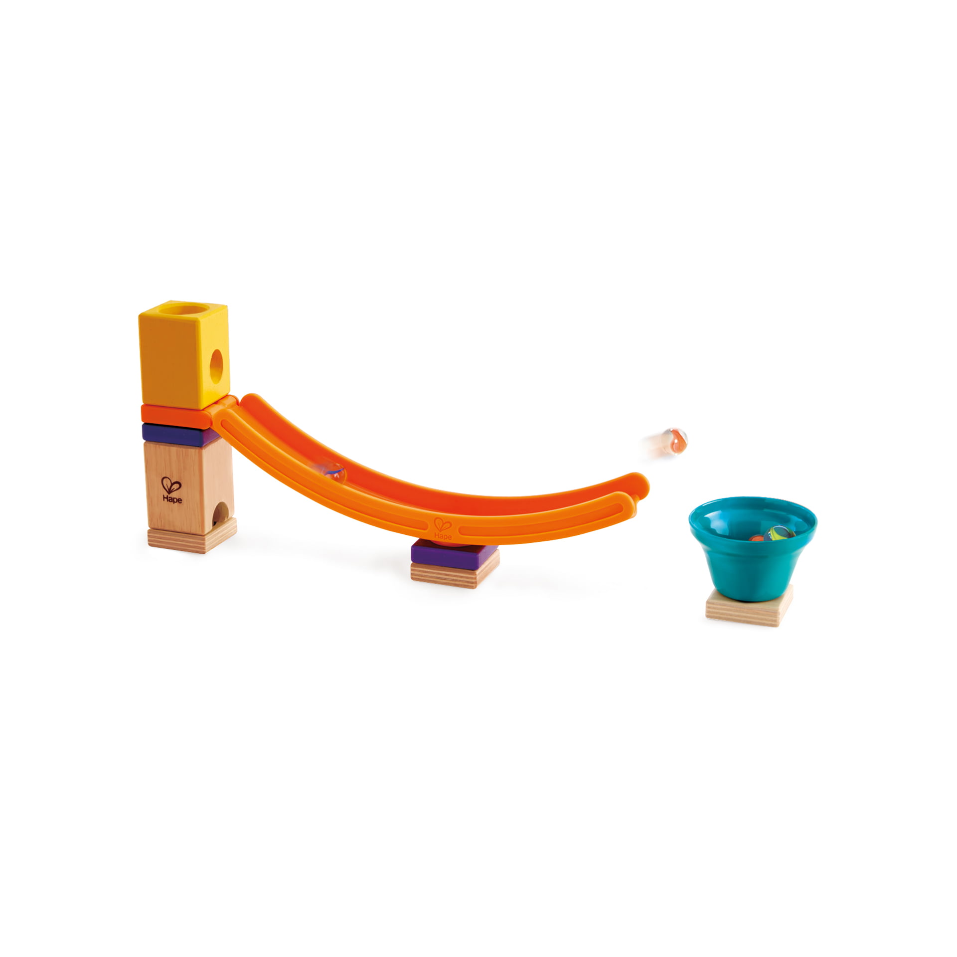Jucarie copii Quadrilla din lemn – set rampa cu bile (17 piese) – Urmariti cum bila intra pe rampa si sare de la capat. Daca o bila aterizeaza in palnia clopotului, se obtine un zgomot satisfacator. Construiti aspectul ilustrat pe cutie si conectati-va la un set Quadrilla existent. Include 2 blocuri distribuitoare, 2 reglaje de inaltime, 3 inele stabilizatoare, 8 bile, o rampa de salt si o palnie . Ajuta la dezvoltarea gandirii spatiale si a intelegerii principiilor stiintei, tehnologiei, ingineriei si matematicii (STEAM) Compatibil cu toate seturile Hape Quadrilla.